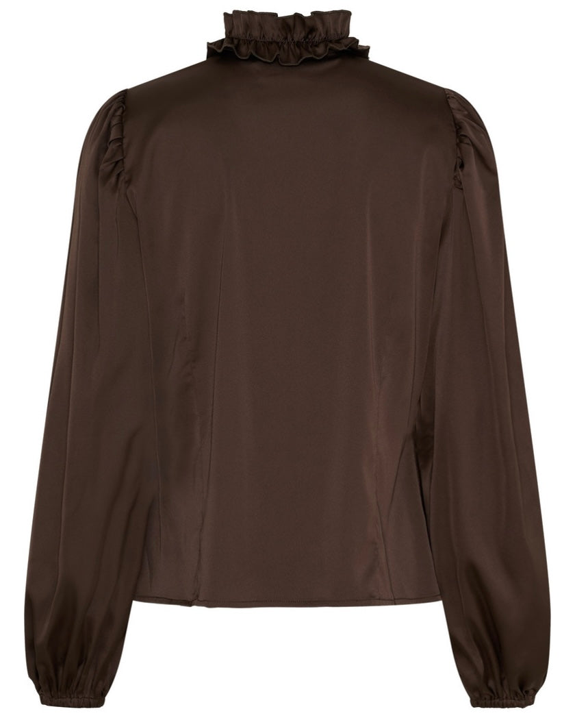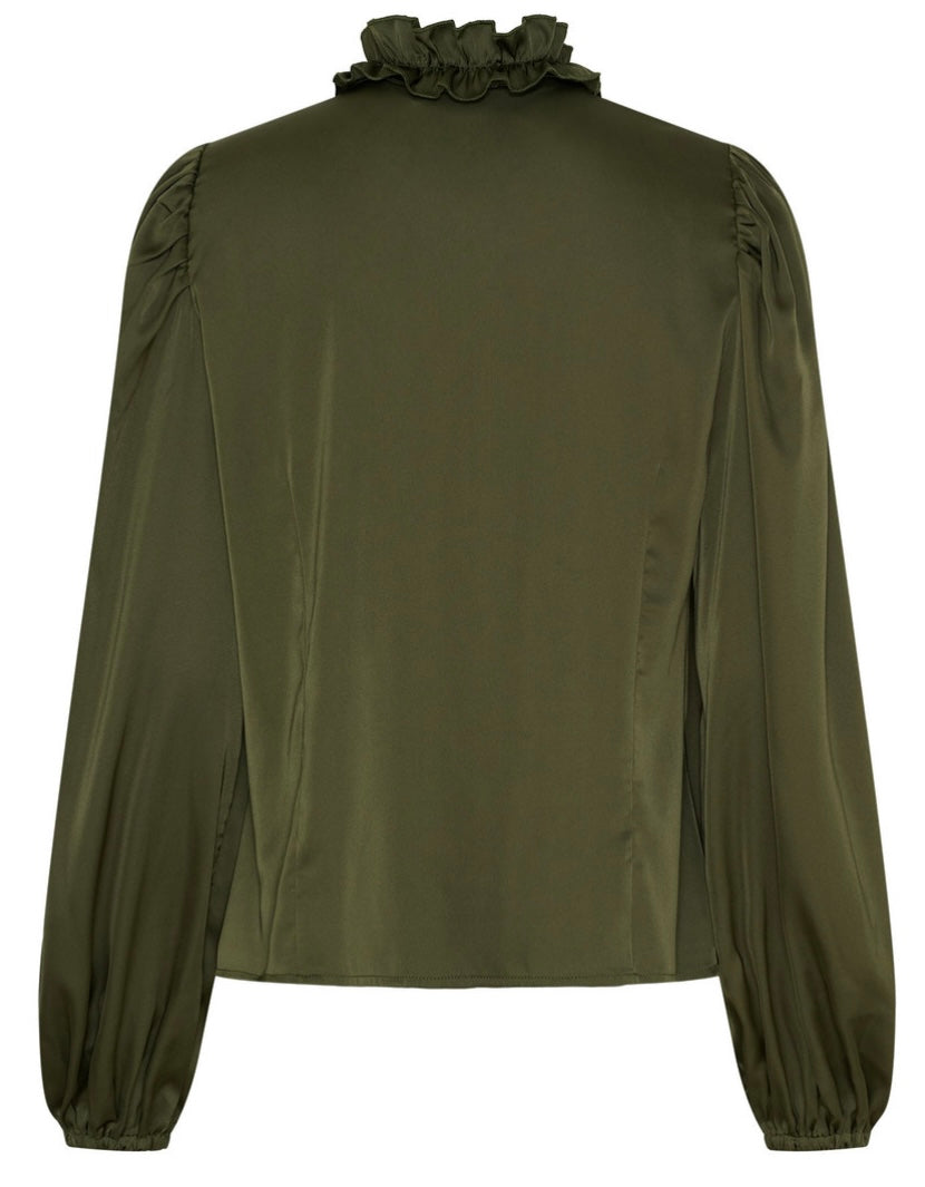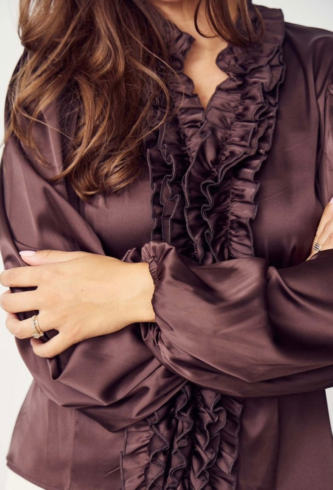 Storsäljande blank och stretchig finblus med volang fram och resår i ärmslutet. OBS inga knappar, så det blir inga glipor!