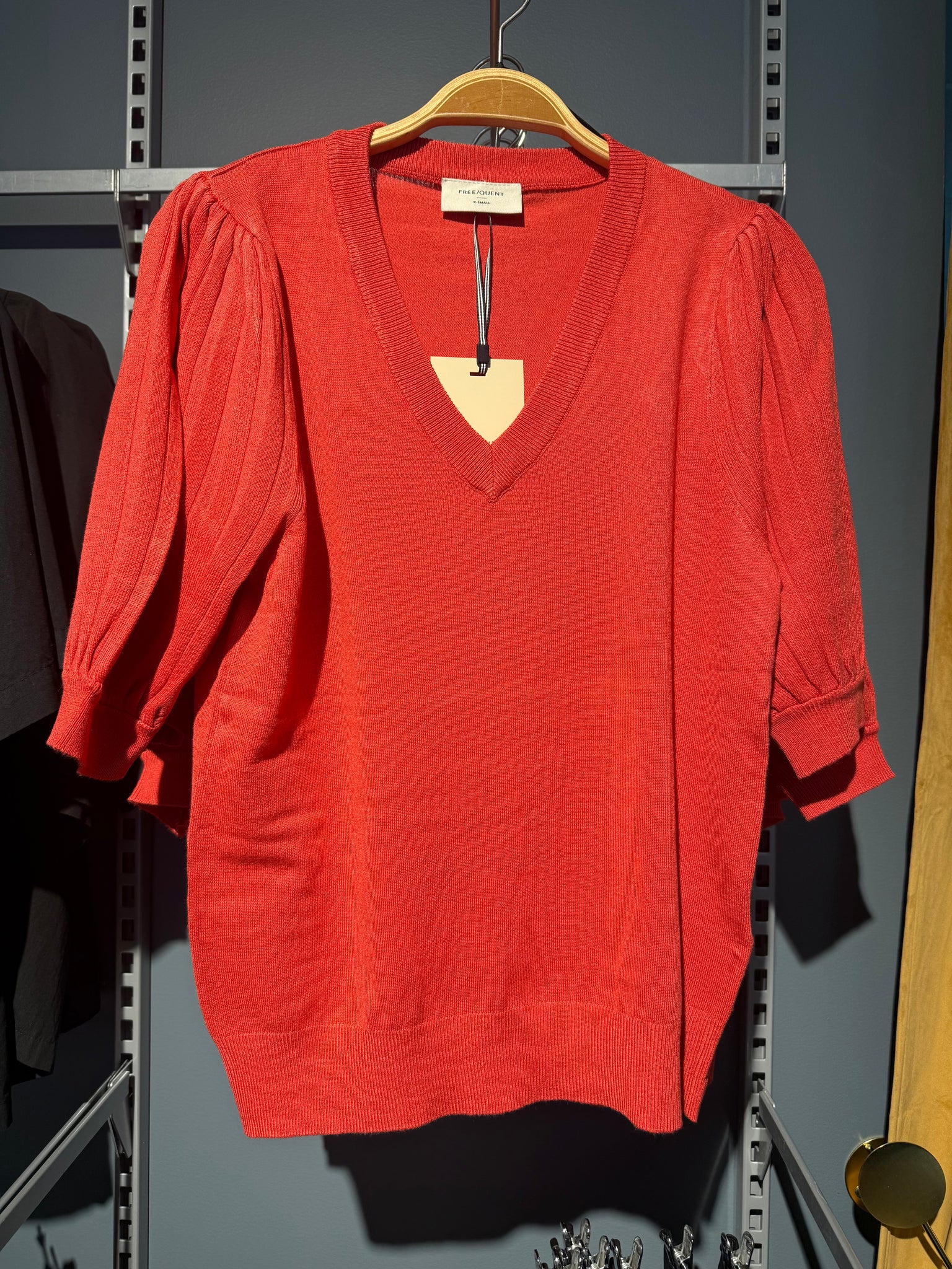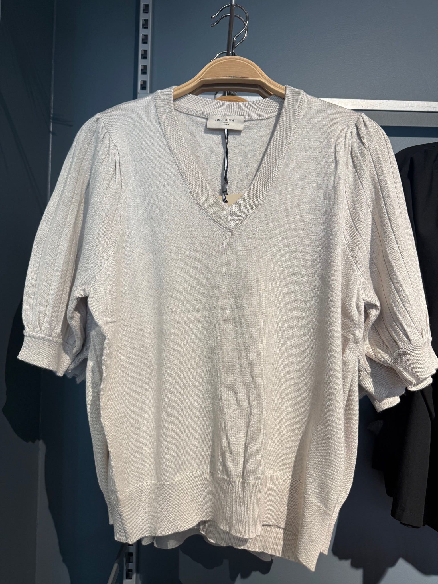 En finstickad tröja med kort strukturstickad ärm. V-ringning.